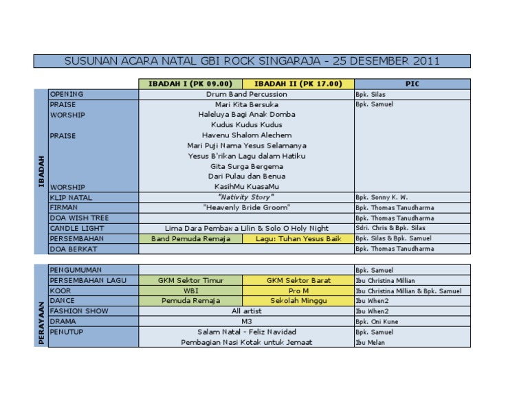 Susunan Acara Perayaan Natal Wbi Gbi Icc from reader015.dokumen.tips Tidak terasa natal sudah semakin dekat. Rundown acara pernikahan atau susunan acara pernikahan adalah hal yang pasti ada di sebuah acara. We wish you a merry christmas, we wish you a merry christmas, we wish you a merry christmas and happy new year. Teks naskah di atas bisa sobat download secara gratis yaitu dengan cara klik di pojok kanan atas makan akan tampil tanda panah. Contoh lainnya misalnya untuk surat dinas permohonan peminjaman ruangan atau inventaris, biasanya akan dilampiri rundown acara maupun sususan panitia dari acara tersebut. Pengertian rundown acara adalah susunan program yang sistematis dari sebuah acara yang dibatasi oleh durasi. Dengan adanya susunan acara, maka panitia bisa mempersiapkan segala kegiatan dengan maksimal dan mengurangi resiko terjadinya kekacauan dikarenakan rundown acara yang tidak jelas. Isplbwiki.net adalah media blog yang mengulas topik seputar teknologi.