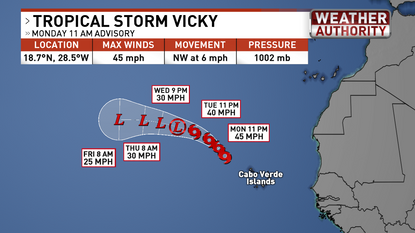 Vicky looked like a wispy ring of clouds on visible satellite imagery and nearby hurricane teddy is at 11 a.m.
