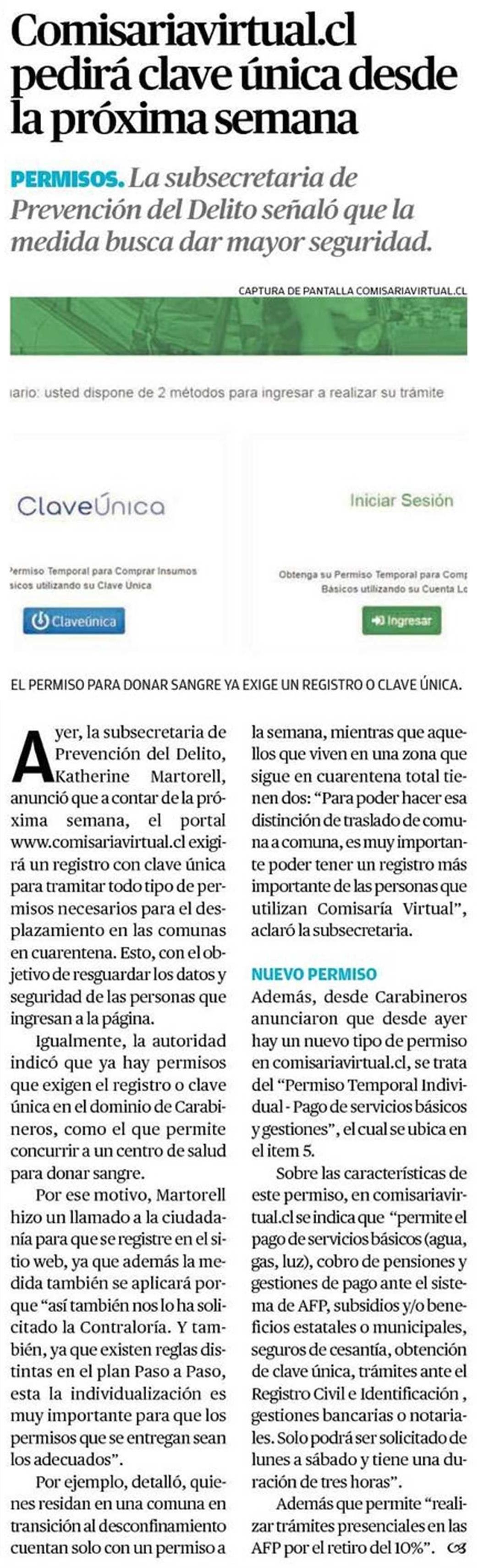 Comisaría virtual permiso temporal individual. Desde hace algunos días, la comisaría virtual comenzó a solicitar clave única o una inscripción de datos en su plataforma para otorgar permisos temporales para circular en medio de la cuarentena. Carabineros informó que, a partir de este lunes 3 de agosto, la comisaría virtual entregará permisos mediante el uso de la clave única o bien con la creación de una cuenta de usuario local. Comisaría virtual exigirá a las personas que solicitan permisos temporales integrar al formulario de solicitud su clave única o crear una sesión local. Para las comunas que están en cuarentena va a haber un permiso especial, que es en el ítem para que la gente que lo necesite, pueda sacarlo desde comisaría virtual, explicó en 24 horas.