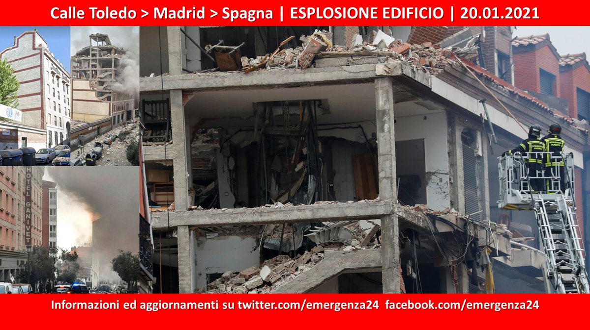 La forte esplosione, riporta il quotidiano la vanguardia, si è verificata nella centrale via toledo, distruggendo quattro piani. Una forte esplosione a madrid ha scosso la capitale spagnola nelle ultime ore. Esplosione a madrid, fuga di gas in un edificio: Una forte esplosione, le cui cause sono sconosciute, ha semidistrutto un palazzo nel centro di madrid attorno alle tre del pomeriggio di mercoledì 20 gennaio. Una forte esplosione ha distrutto un edificio di 6 piani nel centro di madrid verso le tre del pomeriggio.